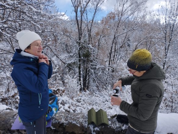 Il est midi, elles ont faim, les vieilles. Pas de cabane ni de banc, mais un muret leur tend les bras. Pour le remercier, elles le déneigent ( elles sont comme ça… les vieilles) et s’assoient au soleil. Vin de noix, pique-nique, biscuits et chocolat partagés font leur bonheur.
