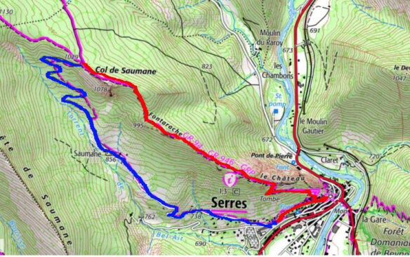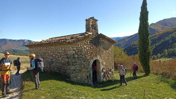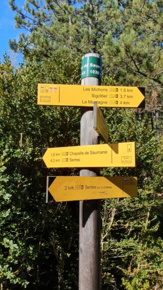 Nous voilà partis à 9h30 du parking devant le collège de Serres, pour prendre le sentier qui passe devant la chapelle de Notre Dame de Bon Secours et qui s’élève en lacets sous les pins.