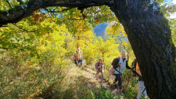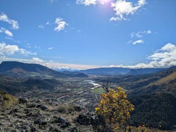 Après la pluie de la veille, nous nous félicitons du beau temps retrouvé. Le chemin suit la crête de Fontarache entre blocs de calcaire, buis et chênes, le panorama s’offre à nous sur la vallée du Buëch et au loin le plateau de Bure.