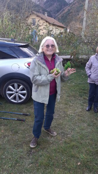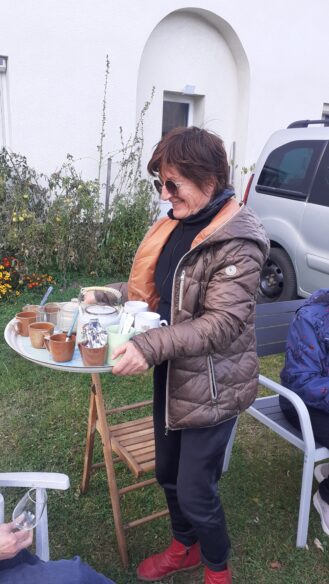 Nous avons retrouvé toute la troupe de Christian attablée dans mon salon de jardin, attendant impatiemment le service de la collation promise : thé, ou café, ou infusion du soir. Puis Champagne, pour arroser la naissance de ma troisième petite fille, ou menthe à l’eau pour les deux personnes allergiques à ce produit hautement recommandé par la médecine (devinez lesquels, car ce sont des hommes). Pour terminer, possibilité pour chacun de faire son marché dans mes  jardinets (tomates vertes pour faire de la confiture, persil…).