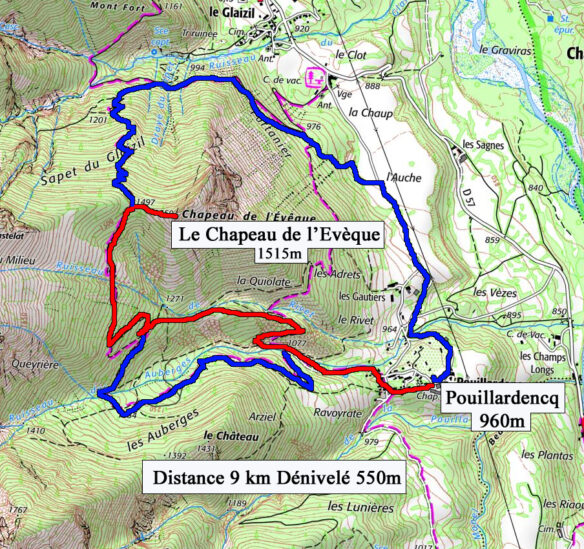 Christian, ayant décidé de redescendre par l’itinéraire que j’avais emprunté à l’aller, j’ai proposé à Jean-Luc de descendre par le sapet du GLAIZIL, ce qui fait faire une traversée complète du chapeau du Sud au Nord. Bascule dans la pente, toujours difficile à trouver, car mal indiquée (je m’y suis perdu une fois avec Claudine). Descente donc en face nord, à l’ombre, dans une forêt de grands épicéas, mais heureusement bien sèche, car se déroulant sur un sentier un peu en dévers et plein de feuilles, sauf à la fin où voulant prendre un raccourci, j’ai fait une glissade dans les mousses et la terre mouillée, sans dégât, sauf pour mon pantalon, un peu sali,(j’espérais avoir une petite écorchure qui nécessiterait les soins de mes Infirmiére préférées). Arrivée sur la piste forestière de Chauvet, avec une belle vue sur le cimetière du GLAIZIL et sa tour du Moyen Âge, et sur le Valgodemard, dominé par l’Olan. Puis, par un nouveau petit raccourci, nous avons rejoint la petite route qui remonte à Pouillardencq sur 1,5 kms.