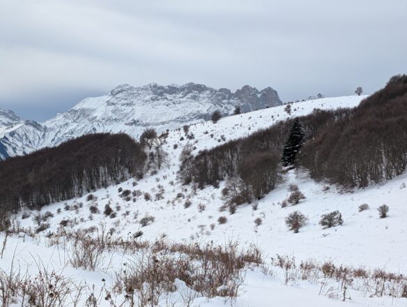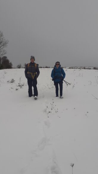 Et l’on poursuit notre chemin sur une ligne de crête où l’on s’enfonce dans 40cm de poudreuse. Certains ont entamé une partie de boules de neige. On dirait des collégiens à la tombée des premiers flocons…