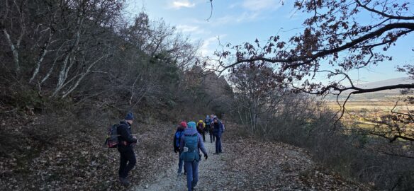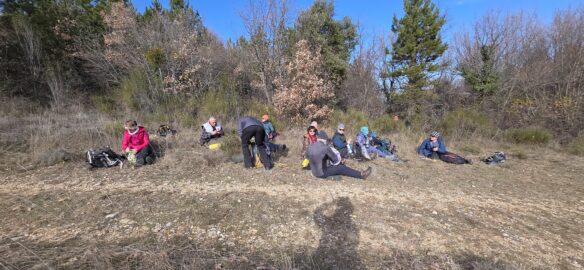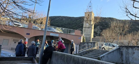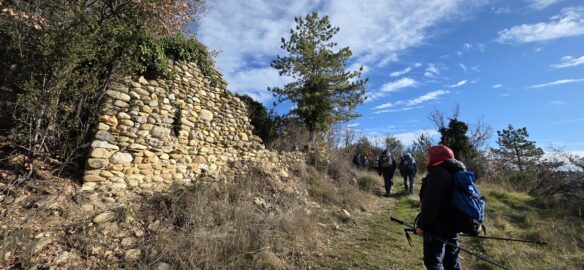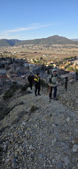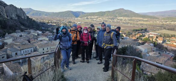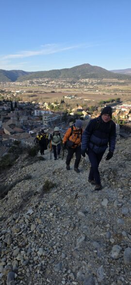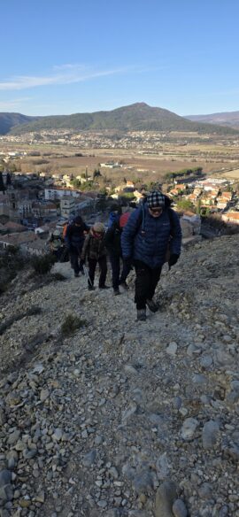 Nous commençons la montée vers la Chapelle St Roch , et profitons du point de vue pour une photo de groupe… depuis les toits du village jusqu’à la vallée de la Durance qui s’ouvre …