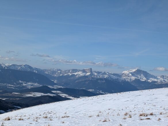 Il fait si beau que les falaises abruptes du Vercors se dessinent nettement et ferment l’horizon au Nord Ouest tandis que le Mont Aiguille se dresse fièrement devant elles avec son plateau recouvert de neige. Le Chapeau de Calvin, l’Obiou, le Pic de Bure, le lac du Sautet ceinturent l’horizon à l’Ouest tandis que les monts du Valgaudemar se déploient à l’Est. (l’Olan, le Grum, le Chaperon, le Ban du Perron mais pas le Sirac que certains arriveront à voir ?)