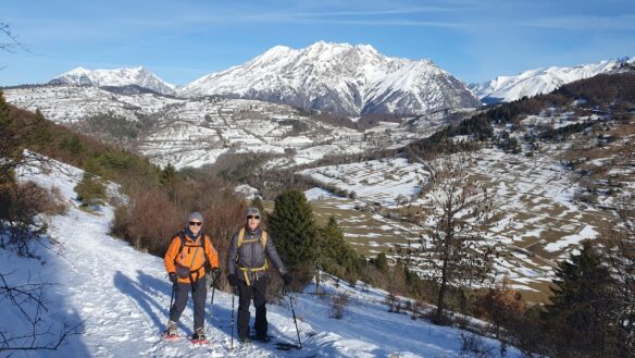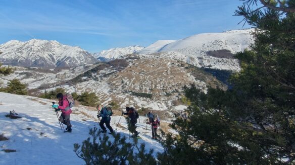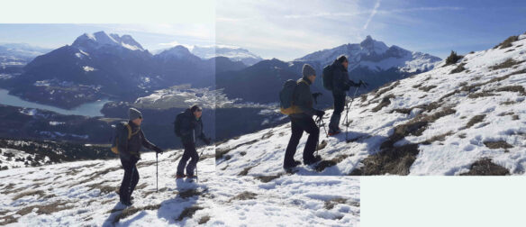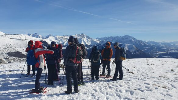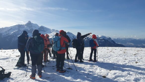 Après avoir quitté le parking il a fallu rapidement passer les crampons ou les raquettes. Encore un truc facile pour les novices 🥺. Mais l’expérience des uns, la bienveillance et l’entraide ont permis à chacun d’être bien équipés et d’avancer en toute sécurité sur ce chemin enneigé, glacé par endroit et qui monte sans cesse jusqu’à notre but, Le Mont Chauvet.