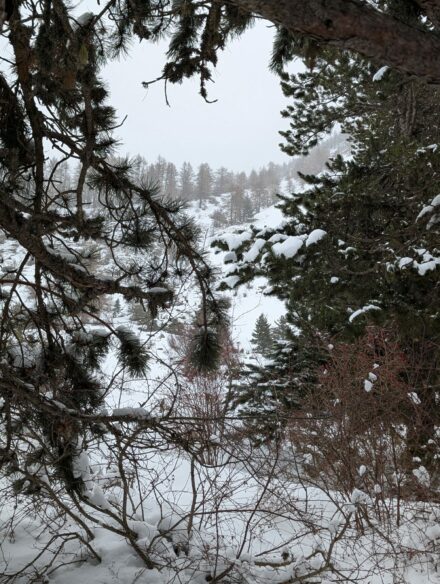 Nous avançons sans peine, le contact de la neige est agréable au pas. Le sentier est tantôt à découvert tantôt protégé par des rangées de sapins qui m’incitent à penser qu’en été, ce chemin est peut-être ombragé…