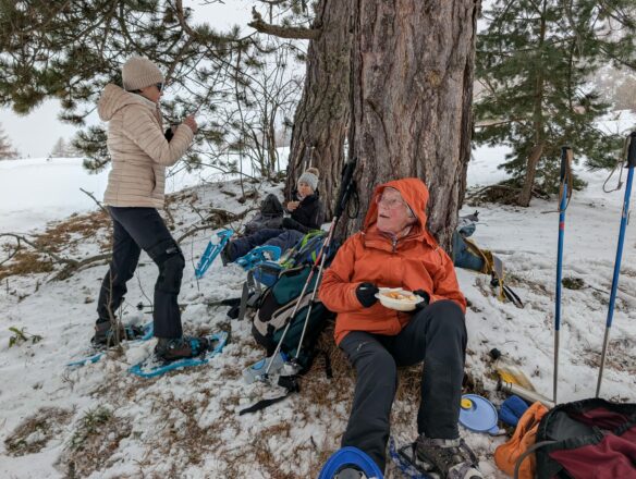 A l’abri de sapins, on s’installe pour un pique-nique rapide…car il fait froid mais Chantal a apporté le vin de citron qui va réchauffer tout le monde.