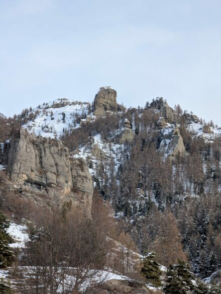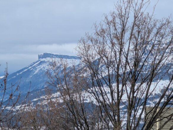 Le sentier est étroit, presque plat, sans difficulté et surplombe la vallée blanchie par les chutes de neige successives. Au loin, on distingue Ceüse nettement à ce moment là. Le temps est gris mais la lumière perce et réussit à donner au paysage, ce ton si particulier.