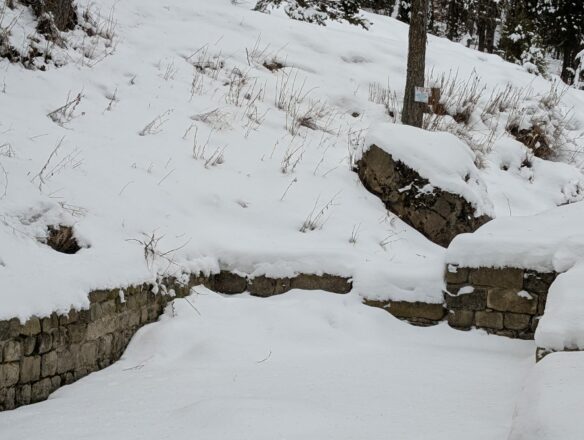 Au détour d’un virage se dessinent des bassins qui nous rappellent que nous longeons un canal d alimentation en eau. En fait, il s agit d une série d’écluses successives qui régulent le débit du canal en cas de besoin. Ce sont les rares témoins de la présence des hommes sur ce flanc de montagne avec les clôtures et les passages aménagés pour contenir le bétail.