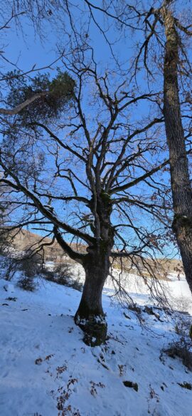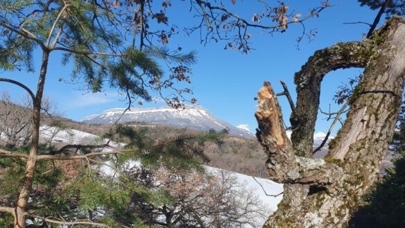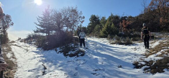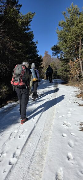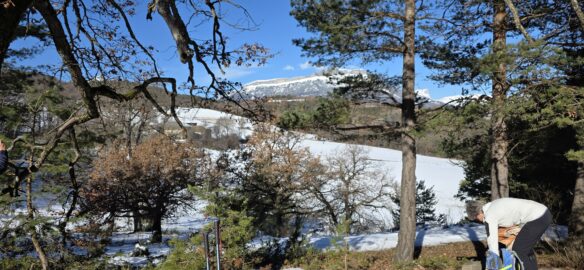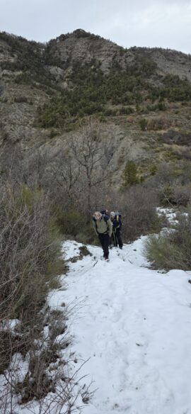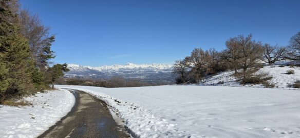 Nous continuons, toujours dans la neige, aux abords du petit hameau de La Pinée, puis nous bifurquons Sud-Ouest, puis Sud pour suivre une sente en balcon, sur le flanc de Serre Soleille…