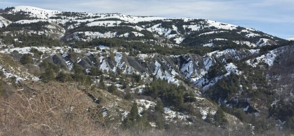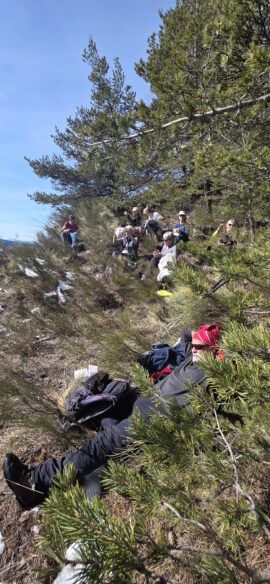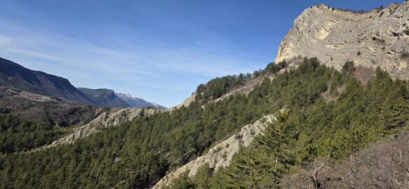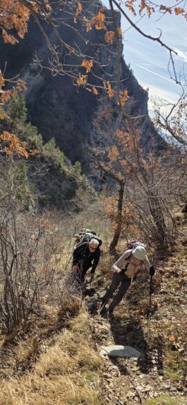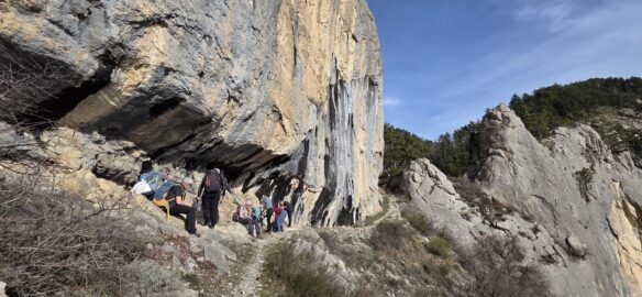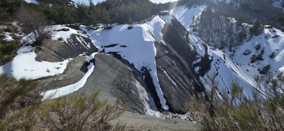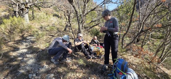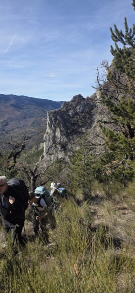 L’effort a creusé les estomacs, et nous montons un peu au-dessus du torrent des Oustaus naissant, dans les genêts pour déballer les sacs… les nombreux cairns faisant un muret sur les marnes noires ont disparu…
