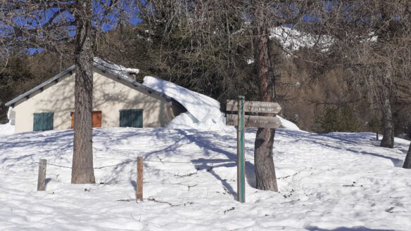 L’arrivée au Col de Gleize se fait sans difficulté après avoir franchi quelques clôtures de pâturage complètement enfouies sous la couche de neige. Et là le paysage est méconnaissable. Un mètre de neige recouvre le toit de la maison forestière, les tables de pique-nique ont disparu sous le manteau blanc. On profite de l’endroit et de l’ensoleillement pour s’hydrater et déguster qui sa banane ou sa barre de céréales. Chantal S. nous propose ses délicieux cubes de pâtes de fruits au coing. Merci à toi !