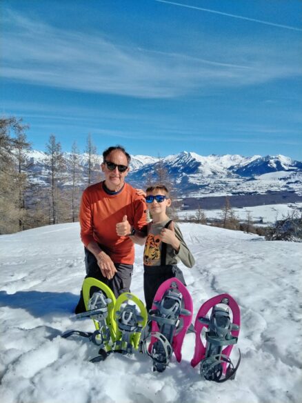 Le reste du groupe est équipé de raquettes aux couleurs vives qui forment presque la palette d’un arc en ciel…Celles de Christian sont remarquables…Non seulement elles ressemblent à celles des trappeurs canadiens comme David Crockett par leur forme mais pourraient être celles d’une Barbie au regard de la couleur 😉!