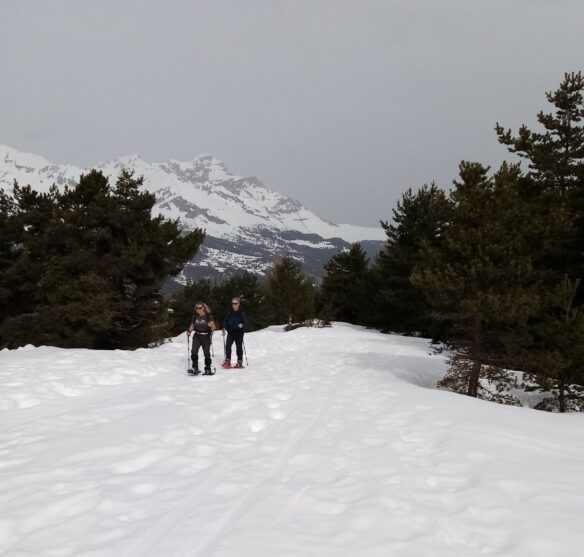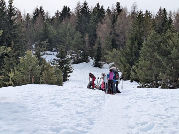 Dès l’arrivée à la station, il faut chausser celles-ci car la neige est tombée abondamment et malgré l’exposition de la station, à cette heure-là, elle est encore bien ferme sous nos pas.