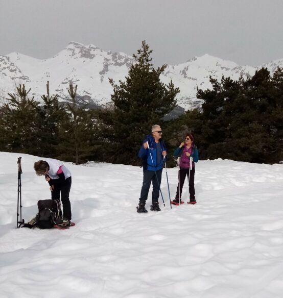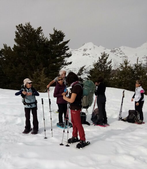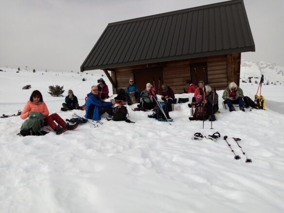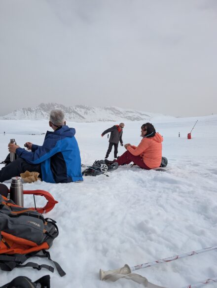 Assis dans la neige, on se rassasie tout en partageant des douceurs. On ignore que le retour commencera par une grimpette et qu’on se dira, une fois de plus, que l’on a trop mangé !