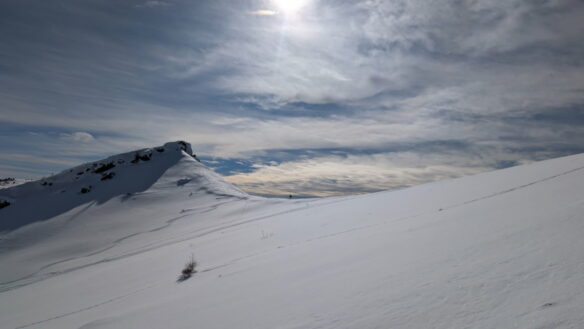 La signalisation « piste raquettes » a disparu. Serge se renseigne auprès des saisonniers qui s’occupent du tire-fesses. On nous indique de suivre la piste bleue empruntée par les skieurs tout en restant bien sur le côté et en étant vigilant si nous devons traverser.
