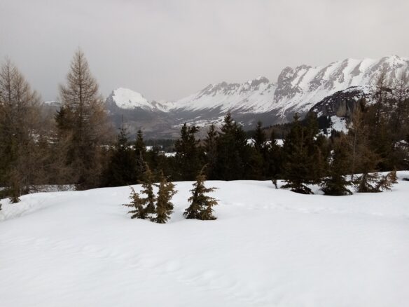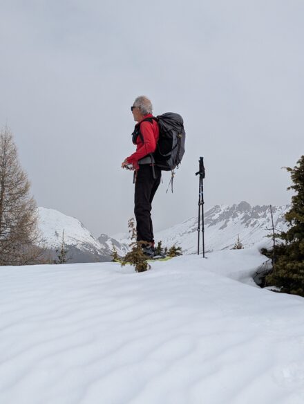 Nous traversons des espaces silencieux, éloignés des pistes. Quelques sapins émergent de l’épaisse couche de neige étincelante. On suit la trace laissée par nos prédécesseurs. Les sables qui ont traversé la Méditerranée ces derniers jours donnent aux paysages une allure fantasmagorique et une lumière tamisée, étrange.