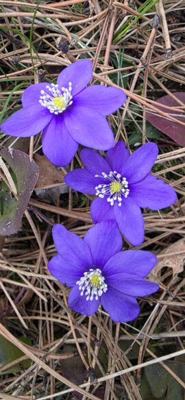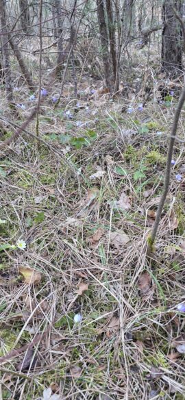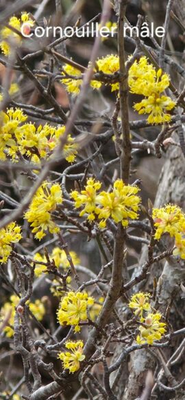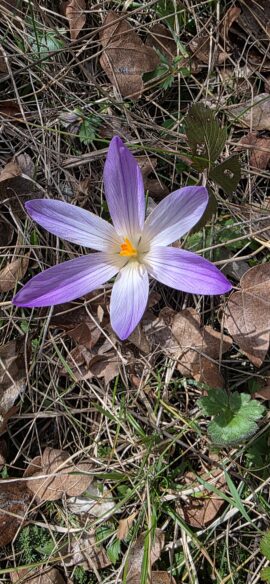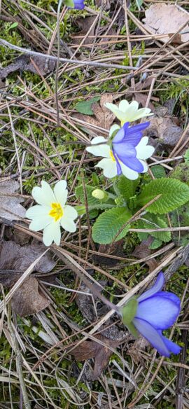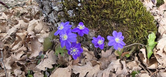 le Printemps se prépare et nous déploie des tapis de primevères, hépathiques, violettes, crocus… jusqu’au Champ de la Dame, juste au-dessous du Rocher Roux, où nous faisons une petite pause…
