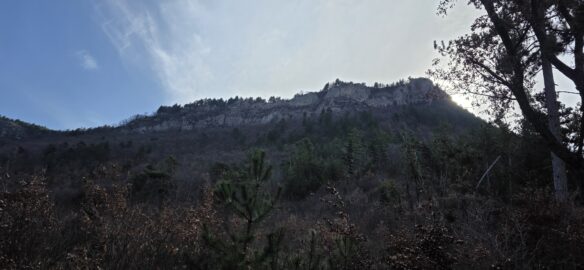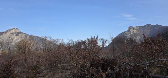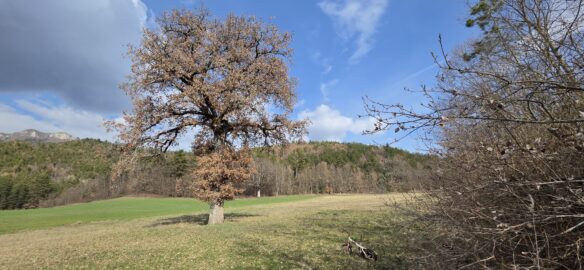 Un peu de route jusqu’au hameau Le Bas Plan avant de bifurquer sur le chemin du Plan… longeant les champs et les vergers… toujours dominé par les rochers de l’Aigle et celui de la Blachère.