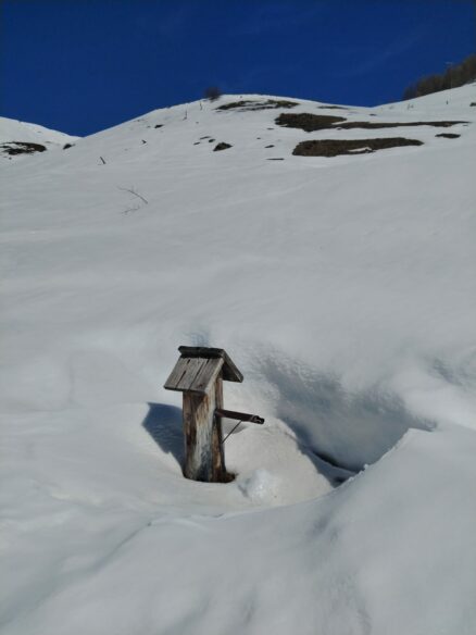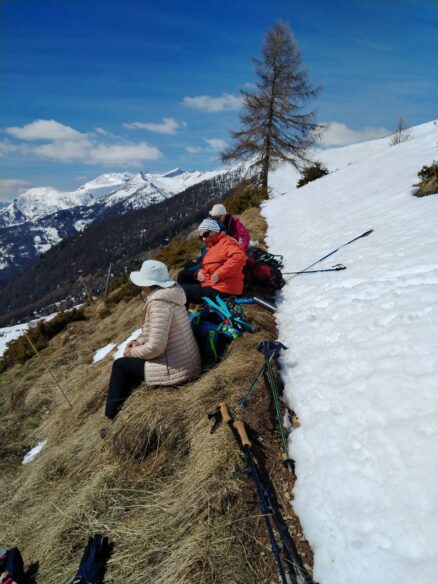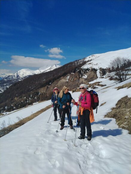 « Pour l’instant, on n’est toujours pas mouillées » glisse malicieusement, l’une des paires. En montant, le chemin s’est élargi, la couche de neige a recouvert la largeur du sentier mais les randonneuses poursuivent leur avancée sans se préoccuper de nous…