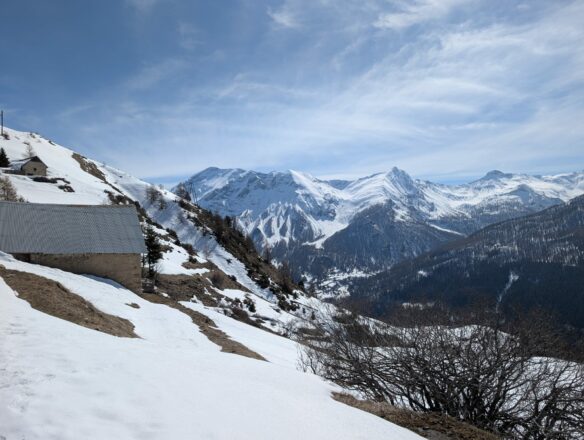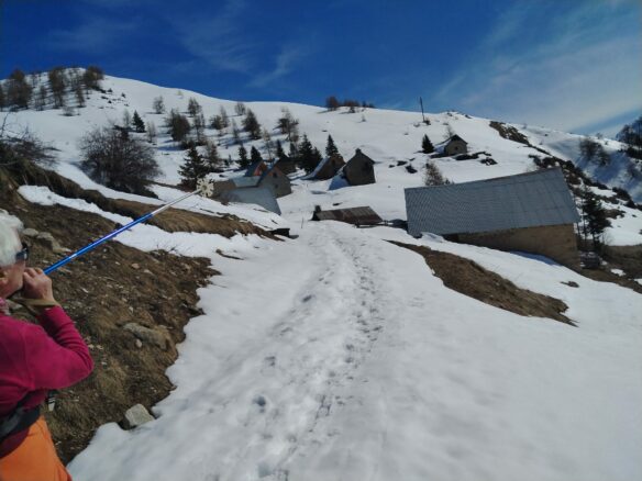 Et puis c’est tellement drôle de les sentir moins assurées au moment où leurs chaussures passent dans nos sangles et qu’ elles font des pas hésitants pour trouver la stabilité, le bon écartement etc. Chabane, un bel endroit de villégiature à gauche se dessine et en levant le nez vers la droite on voit les façades des chalets des Marches. « Comme il doit faire bon à se sécher sur ces terrasses exposées au sud après la rando » se disent à mi-voix nos raquettes.