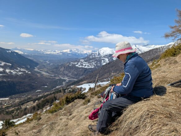 Le banc repéré lors de la reconnaissance n’est pas au rendez-vous. On a dû emprunter un chemin un tantinet plus haut et du coup on se pose sur le bord d un talus avec un point de vue superbe sur le Drac.