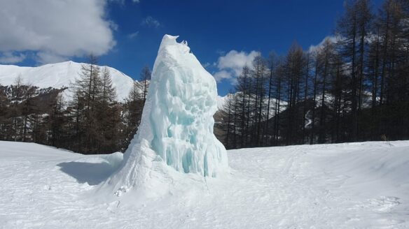 Nous suivons le balisage, le même emprunté par les skieurs de ski nordique, d’abord en sous-bois, puis à découvert, pour arriver au fameux « couloir d’avalanche » (pas de risque aujourd’hui) et atteignons le Pré Premier et le lac gelé de l’Eychaillon.