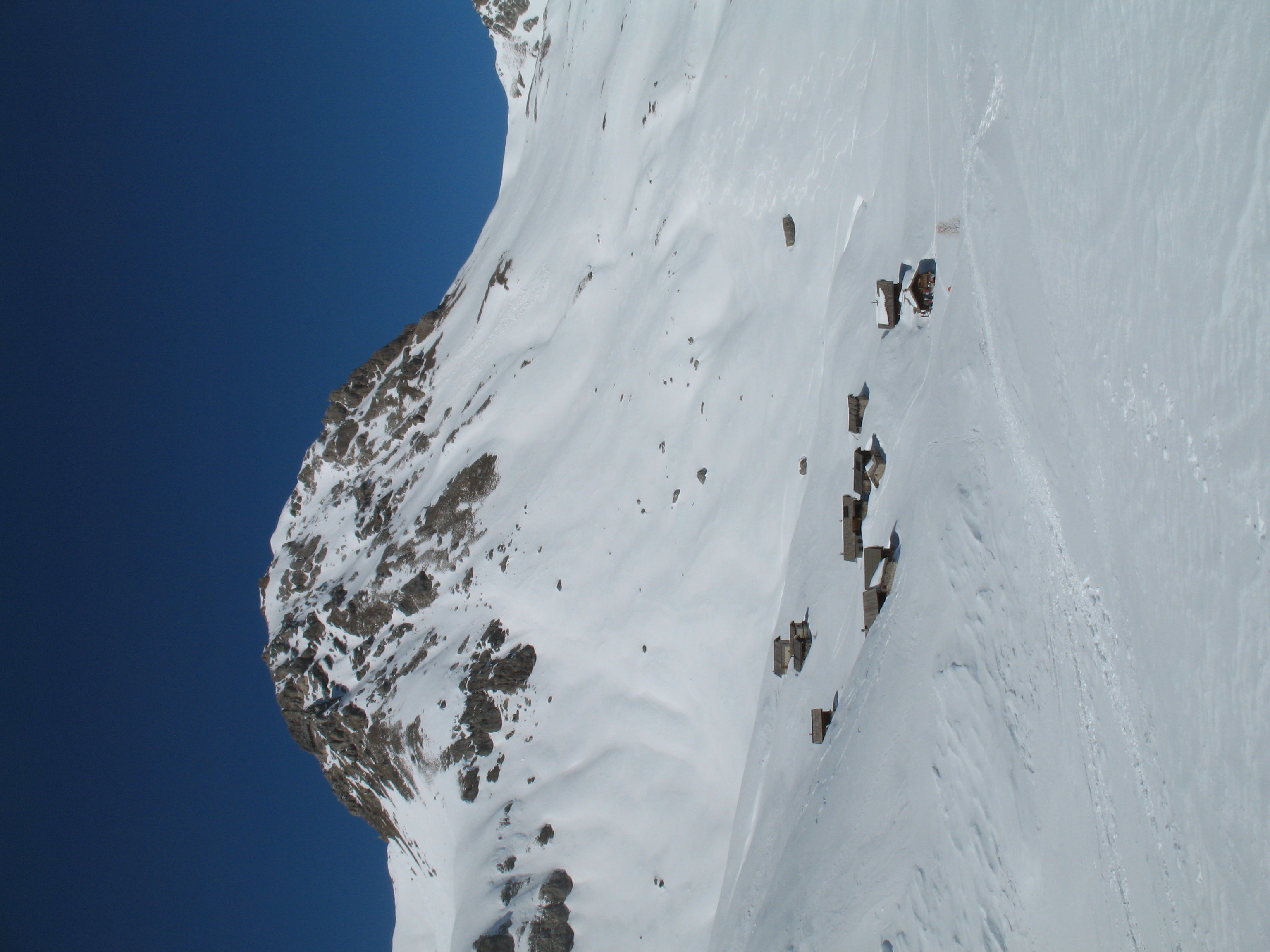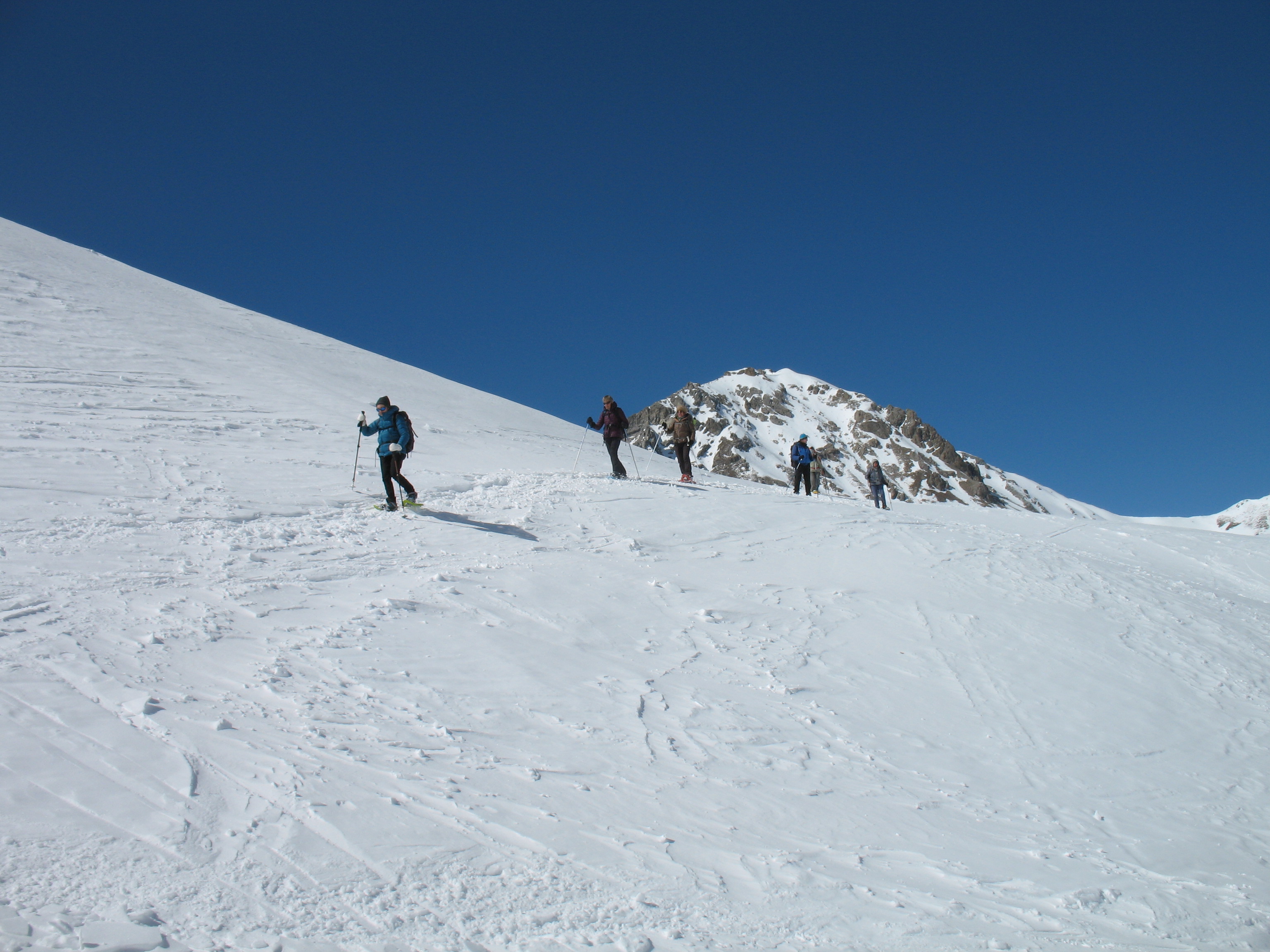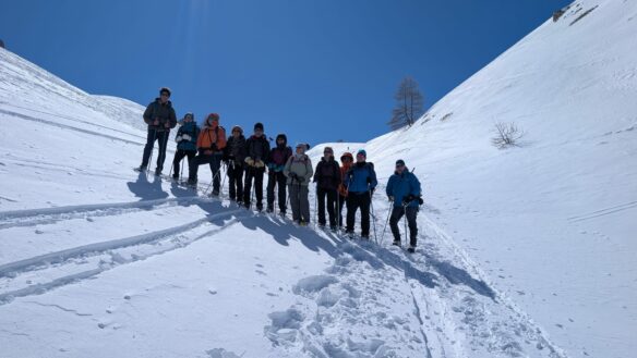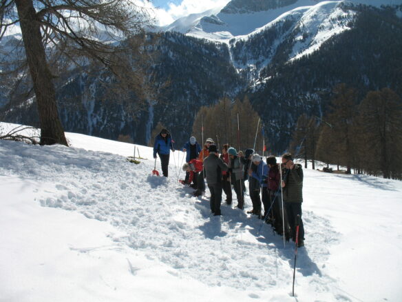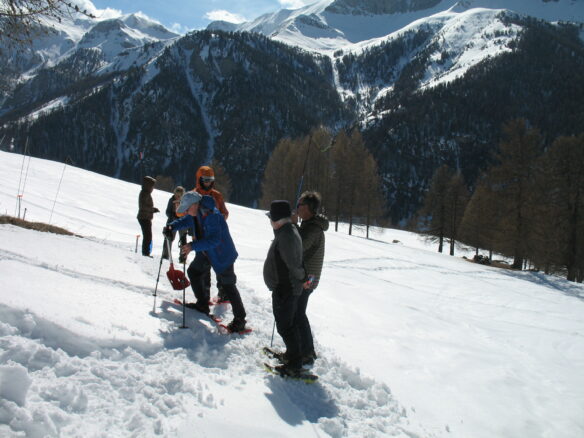 Patrice, notre guide, avise une pente pour nous faire réviser (ou apprendre pour certains) l’utilisation du matériel de recherche des « victimes d’avalanche ». On espère bien ne pas avoir à l’utiliser.