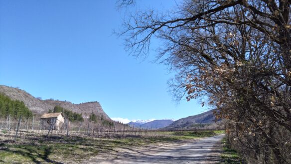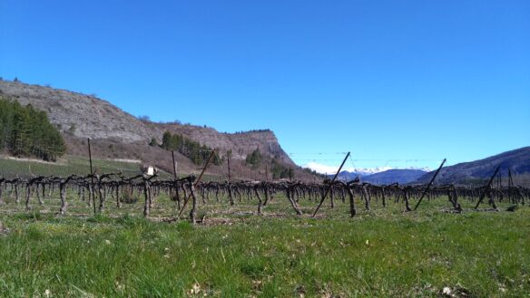 Peu après le domaine viticole de Tresbaudon, nous tournons à droite pour prendre un petit chemin qui nous permet de commencer la montée vers la crête de Saint-Abdon surplombant la Durance.