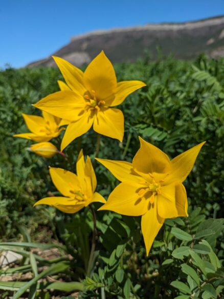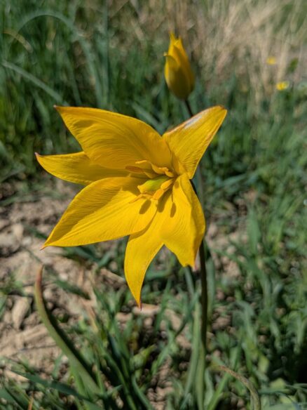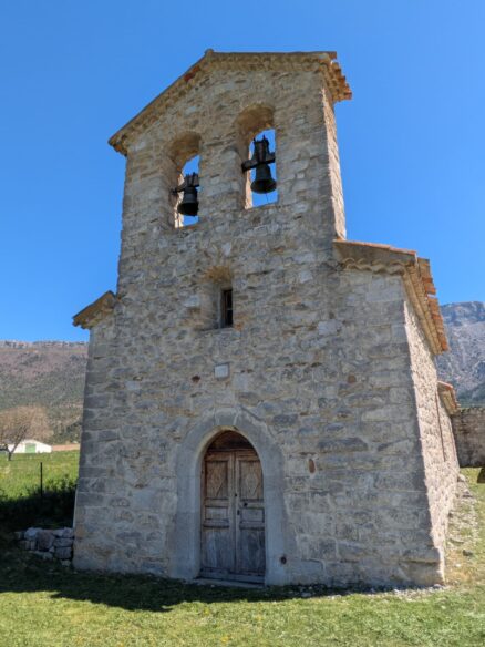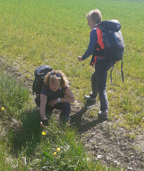 Nous entamons la descente en direction du col de la Croix, puis nous nous orientons vers la chapelle et le cimetière de Villelongue. En chemin, nous observons les premières tulipes épanouies.