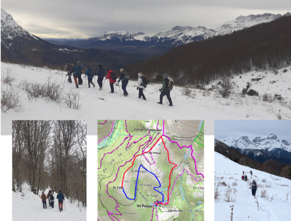 La rando douce ça laisse le temps à l’esprit de divaguer, au regard de s’accrocher aux paysages ou d’explorer la flore et parfois la faune comme savent si bien le faire Roselyne et Élisabeth. Peu de flore avec ces frimas mais des traces qui nous intriguent. Pattes de renard, empreintes de souris, traces de loup, sabots de cervidés ? Christiane et Christian nous éclairent au fur et à mesure de nos découvertes.