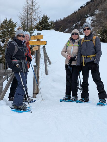 Sans l’ombre d une hésitation on chausse tous nos raquettes dès le départ et l’on s’engage sur une sente enneigée qui contourne les installations hivernales. Le dénivelé de la randonnée est pratiquement condensé à ce point. On s’élève lentement en direction du canal car avec le temps frisquet et humide de ce matin, il faut s’échauffer…